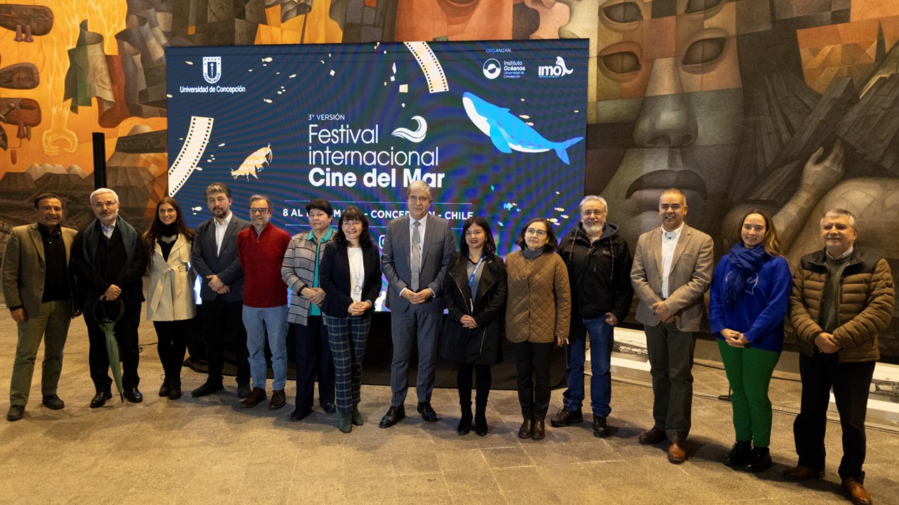 Con gran entusiasmo y una destacada convocatoria, se lanzó oficialmente el 3er Festival Internacional de Cine del Mar el martes 6 de mayo en el Salón del Mural de la Casa del Arte de la Universidad de Concepción. La ceremonia, encabezada por el Rector Dr. Carlos Saavedra Rubilar, el Director del Instituto Océanos, Dr. Osvaldo Ulloa, y el Director del Festival, Pablo Rosenblatt, marcó el inicio de la cuenta regresiva para este esperado evento cultural y científico que se desarrollará del 8 al 10 de mayo con entrada liberada a todas sus actividades.